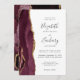 A borda esquerda deste elegante convite de casamento moderno mostra uma borda de água borrifada, cortada com falsa brilho dourado. O texto personalizável combina manuscrito, copperplate e fontes itálicas em cinzas de carvão em um fundo branco. O lado inverso apresenta uma burgundy e uma design de agata dourada.