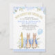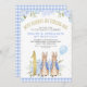 Dourado Blue Twins Floral Peter Rabbit Convite para primeiro aniversario Sweet bunny recebeu o primeiro convite de aniversário para gêmeos com duas ilustrações fofinhas de Peter Rabbit, vários arranjos florais de azul-bebê, pontos falsos de brilho e número de folha de ouro falso. O design também apresenta um padrão de xadrez azul. O cabeçalho e o número do dourado falso são removíveis. Esta design é ideal para alguém que tenha uma festa de aniversário temática Peter Rabbit.