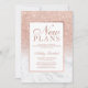 Anuncie o adiamento do seu casamento, evento ou aniversário e novos planos com este moderno, bonito chic e elegante chuveiro brilhante dourado rosa falso com fundo de mármore branco.