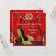 Elegante vermelho e ouro brilhando alto salto calçado mulher entrando em sessenta e sessenta convites de festas de aniversários com belos calçados de salto alto e brilho dourado em um fundo de cortina vermelha e dourada. Este elegante convite de aniversário vermelho e dourado é facilmente personalizado para o seu partido ou evento, adicionando detalhes do evento, estilo de fonte, tamanho de fonte e cor e texto.