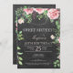 Convite de aniversário de dezesseis anos rústico elegante com rosas peônia pintadas à mão em rosa e vermelho burgundy com folhas e folhagens verdes e com um script de caligrafia editável moderno e chique sobre um fundo de quadro negro de carvão cinza escuro. +++++++++++ Adequado para uma festa de aniversário de dezesseis anos de primavera, verão, jardim ou outono / quintal ao ar livre / floral vintage.