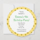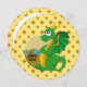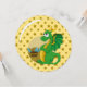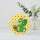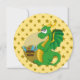 Print invites for birthday party with illustration of cute green dragon guardian guarding a treasure, on seamless golden yellow pattern with stars, fantasy fairy-tale design for kids; suitable for girls and boys