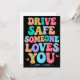 Warm reminder message with colorful hand lettering on a dark background. A gentle and emotional phrase that encourages safe driving and shows care, love, and connection for family, friends, and loved ones.