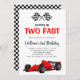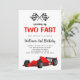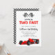 Dois Convites de festas de segundo aniversário Fast Race Car Boy apresentam um adorável design centrado em um tema de carro de corrida, mostrando uma ilustração de um carro vermelho vibrante. O texto brincalhão anuncia: "Crescendo dois rápido." Não perca a chance de se juntar à comemoração!