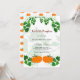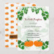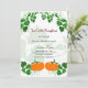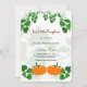 Convite de chá de bebê temático de Halloween com duas laranjas quentes e design de abóboras pintadas em aquarela verde.