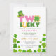 Duas Ruas de segundo aniversário de Shamrocks Sortudos. Rua bonita, no dia de Patrick o segundo convite de aniversário do bebê "Dois Sortudos" com chapéu de duende e biscoito de shamrock e encantos sortudos.