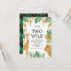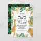 Celebrar o segundo aniversário de sua coisa selvagem com este convite temático safari da selva, com folhas falsas de ouro (girafa, leão e macacos), folhagem dourada e selva verde, e borrão de ouro confete. Adicione o nome do seu filho e os detalhes da festa em texto preto sobre um fundo branco. Um padrão de folhagem em verde e dourado em fundo preto decora a parte de trás da carta.