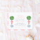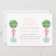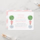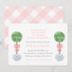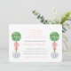 Topiária pintada à mão em um vaso de jarro de gengibre adornado com laço rosa frouxo para este design clássico de convite de chá de bebê.