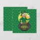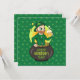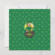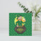 Convite com uma ilustração de um leprechaun sorridente vestindo um terno verde, uma gravata borboleta e um chapéu-coco enquanto sentado dentro de um pote de ouro e segurando um pinta de cerveja, com um arco-íris amarelo, verde e laranja ao fundo. A imagem é colocada sobre um fundo verde escuro sem emendas com trevos.
