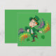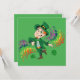 Convite com uma Ilustração de um duende feliz sorridente e dançando, ele está vestindo um terno verde e um chapéu alto e está cercado por respingos coloridos de arco-íris