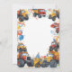 Bold primary colors burst off the page—construction yellow, safety orange, sky blue, grass green, and cherry red—creating an energetic celebration vibe perfect for truck-obsessed kids. A playful star burst border with festive framing surrounds a generous clean center space for all your personalized party details.