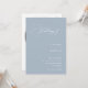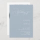 Este elegante convite para o casamento apresenta uma design refinada com um texto romântico em forma de arco que inclui as palavras "Casamento de" elegantemente escritas no topo, acrescentando um toque formal e eterno num fundo azul empoeirado. Aliado à tipografia serif limpa e a uma escrita manual moderna, esse convite minimalista é perfeito para casais que buscam um equilíbrio entre sofisticação e simplicidade. O design também inclui espaço para uma foto do casal e um código QR na parte traseira para opções de RSVP sem problemas. Tente se tornar ecológico com este convite moderno, tudo em um, ecológico, reduzindo o RSVP adicional e os cartões de detalhes. Basta adicionar seu próprio código QR à parte traseira do convite para seus convidados para RSVP e descobrir mais informações sobre seu casamento. Personalize os nomes e o texto em apenas alguns passos fáceis e personalize o cartão de convite com sua foto do casal feliz para lhe dar um toque exclusivo e pessoal. Por favor, note: o texto geométrico circular de "Por favor, junte-se a nós para o" juntamente com a elegante e bela tipografia de "Casamento de" na frente do convite E a menção "gentilmente responda por" no verso do convite juntamente com outros elementos gráficos trabalho de arte, como as linhas, não podem ser editadas, alteradas, movidas ou eliminadas. Eles estão consertados. Se precisar alterar a cor, você pode personalizar o cartão de convite. Você pode personalizar facilmente este convite com seu próprio texto e compartilhá-lo digitalmente através de texto, email ou mídia social. Como alternativa, você pode enviar uma versão impressa para seus convidados ou fazer ambos — enviar uma versão digital e acompanhar uma cópia impressa para obter uma experiência mais personalizada.