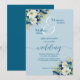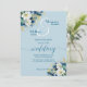 Um convite elegante para casamento com flores azuis empoeiradas e douradas brilhando e caligrafia elegante que você pode personalizar com seus detalhes.