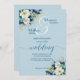 Um convite elegante para casamento com flores azuis empoeiradas e douradas brilhando e caligrafia elegante que você pode personalizar com seus detalhes.