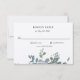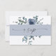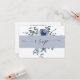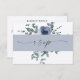 Um belo rsvp floral azul empoeirado com flores de aquarela, texto preto junto com um sotaque azul empoeirado.