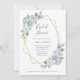 Este simples e elegante chá de panela de casamento apresenta folhas românticas de cor aquática de eucalipto e rosas azuis empoeirados e flores de hydrangea em um falso quadro geométrico de ouro e um fundo branco.