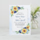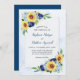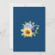 Estes convites modernos de casamento apresentam um design floral de aquarela com girassóis, híbridos e flores azuis marinho em fundo de aquarela. Personalize o texto do convite com o seu próprio texto.