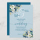 Um convite elegante para casamento com flores azuis empoeiradas e douradas brilhando e caligrafia elegante que você pode personalizar com seus detalhes.