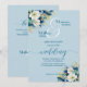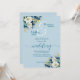 Um convite elegante para casamento com flores azuis empoeiradas e douradas brilhando e caligrafia elegante que você pode personalizar com seus detalhes.