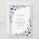 This design features a soft watercolor palette of dusty blue and peach tones. Elegant blue anemones and peach blossoms are nestled among muted slate foliage to create a romantic, airy feel. The luminous floral arrangement provides a whimsical, hand-painted aesthetic that is ideal for a spring event.