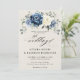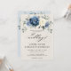 Convite para o casamento floral azul empoeirado, com buquê elegante de azul marinho, azul real, branco, ouro, marfim de champanhe, rosa de cor esbranquiçada, botões de flor ranunculus e folhas de eucalipto verde-sábio e buquê de cor d'água elegante. Entre em contato comigo para obter ajuda sobre a personalização ou se você precisar de outro produto com este design.