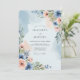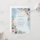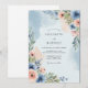 This design showcases a serene palette of slate and sky blue watercolor washes. Delicate peach peonies and deep blue anemones are layered with soft sage green eucalyptus foliage. The romantic atmosphere is captured through airy botanical illustrations and a painterly aesthetic.