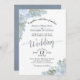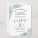 Este convite para o casamento apresenta um design floral de cor d'água rústica com rosas pintados à mão e flores em tons de azul poeirento, com folhas de eucalipto folhagem e verde. A inscrição é feita em caligrafia de rico com um fundo branco clássico. A parte de trás do convite é uma cinza azul com um buquê de floração e folhagem amarrada com um arco branco.