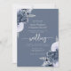 Este elegante convite de casamento apresenta buquês florais azuis empoeirados saltados com folha verde prateada em dois cantos, num fundo azul empoeirado. O texto personalizável combina fontes de cinza prateada se, itálico e de escrita manual. O verso fornece espaço para detalhes do casamento em um fundo azul empoeirado sólido, junto com um código QR que os convidados podem digitalizar para visitar seu site e RSVP, o que economiza o custo de imprimir e enviar cartões RSVP separados.