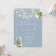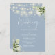 Este elegante convite de casamento azul empoeirado, com luzes de cordas bonito e verde floral, pode ser personalizado com suas informações em tipografia quic com os detalhes do seu website de casamento e seu código QR no verso. Projetado por Thisnotme©