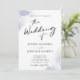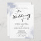 Tudo em um código QR RSVP Chic Modern Black Calliografia Dusty Blue Watercolor Convite para Casamento... Nosso convite de casamento para lavagem de cor azul empoeirada e empoeirada de moda apresenta um roteiro de caligrafia moderno combinado com texto de serif e sans serif para um convite de casamento simples e chic. A parte traseira do convite também exibe o código QR do seu site de casamento, assim como o próprio URL do site, permitindo que seus convidados RSVP online sejam facilmente visualizados e todos os detalhes normalmente enviados em um pacote de casamento. O exemplo de modelo de gráfico de código QR e todo texto de exemplo (além dos elementos de caligrafia gráfica) podem ser facilmente revisados com suas próprias informações sobre o modelo de personalização.