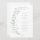 Flores silvestres de cor aquática delicadas e elegantes, ao lado de seus detalhes de eventos. Paletas de pastel de amarelo macio, branco esbranquiçado, verde-sábio, azul empoeirado e verde botânico, simples e romântico. Excelente de brunch floral e convites de chá de panela espumantes para o moderno partido rústico, festas de jardim boho country no primavera e verão.