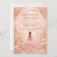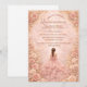 This elegant quinceañera design features a soft dusty blush watercolor background framed by romantic roses, delicate florals, and refined gold accents, with a graceful gown illustration creating a warm, dreamy atmosphere. The muted pink palette and floral detailing give the design a luxurious yet youthful feel, making it perfect for a classic quinceañera celebration with a romantic garden-inspired aesthetic.