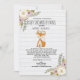 Um convite de chá de fraldas com ilustração de uma raposa bebê vestindo uma coroa de flores. Poema personalizado. Personalize o texto. O fundo é a cinza de madeira de design leve inspirada.