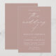 Convite de casamento minimalista e moderno, com detalhes de seu casamento em letras brancas simples com "o casamento de" em um roteiro elegante de caligrafia. O fundo poeirento do rosa pode ser alterado para uma cor de sua escolha. Projetado para coordenar com a nossa coleção de casamento do Modern Elegance.