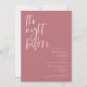 Um convite minimalista de janto de ensaio de casamento com uma letra moderna que diz "na noite anterior". O fundo é rosa empoeirado.