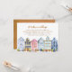 Um design de aquarela com ilustração de casas coloridas com plantas, bancadas e bicicletas com "ele leva uma vila" escrito em letras elegantes no topo do convite. Estas cartas invertem para uma imagem de lavagem a aquarela marrom. Para personalizar, basta editar o texto nas caixas modelo!