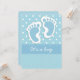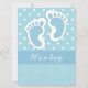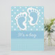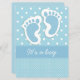 Este convite do chá de fraldas caracteriza um design de duas pegadas do bebê azul, em um fundo azul e branco variado das bolinhas. A listra center tem detalhes de costura, e "é texto customizável de um menino". O fundo azul na parte traseira, e o texto informativo, podem ser personalizados como desejados.