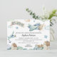 Celebre a chegada de um bebê com este belo convite de chá de fraldas com um avião azul voando sobre a cidade com um cartaz anunciando "É um menino!". Nuvens, pássaros e estrelas enche o céu nesta cena do livro de aquarelas para celebrar a feliz ocasião. Personalize o texto do exemplo com os detalhes do seu chá de fraldas.