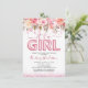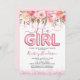 Convites de chá de bebê bonitos com um simples fundo branco, bonito brilho, elegantes florais cor-de-água rosa, o ditado "é uma menina", e um modelo de celebração de bebês que é fácil de personalizar.