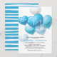 Convites de churrasco de bebê menino com um fundo branco chic que pode ser alterado para qualquer cor, balões de coração azuis e brancos fofos e um modelo de festa de bebê moderno que é fácil de personalizar.