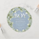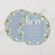 Convite de chá de bebê menino com tipografia elegante e folhagem botânica bonita em um fundo azul empoeirado. Criado por Thisisnotme©