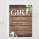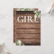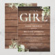 É um convite de chá de bebê 'é uma menina' com tipografia elegante e folhagem botânica bonita em um fundo de madeira rústica. Desenhado por Thisisnotme©