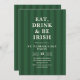 The card features a backdrop of bold, preppy green stripes, creating a vintage-inspired look that feels energetic yet tailored. The playful headline, "Eat, Drink & Be Irish," sets a fun, welcoming tone immediately, inviting guests to let loose. Despite the spirited message, the event details are grounded in a crisp, traditional serif font, ensuring the invitation remains legible, polished, and effortlessly chic. It’s the perfect way to gather your favorite leprechauns for a night of food, friends, and festivities.
