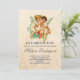 Um convite de chá de bebê com um fundo estilo pergaminho vintage. Sobreposto estão 2 anjos querubins, um sussurrando para o outro.