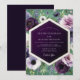 This botanical design showcases a deep eggplant and lavender color palette accented by crisp white anemones. The dark, moody floral arrangement includes lush roses and detailed greenery over a soft sage background. A sophisticated aesthetic is achieved through the contrast of dark blooms and delicate leaves.