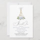 Ela disse que o Chá de panela da Torre Eiffel Francesa apresenta o ouro Torre Eiffel com arco azul no topo e flores azuis com verde. Trás do convite tem listras azuis de bebê. Envie-me uma mensagem para todos os ajustes necessários ou itens correspondentes.