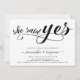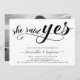 O roteiro de caligrafia moderno, moderno, simples e de festa de noivado apresenta um roteiro de caligrafia '', ela disse sim'' em letras escritas à mão, nomes de casais e detalhes de festas. Adicione a foto favorita do casal atrás.