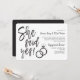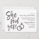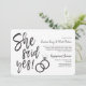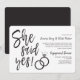Um convite divertido e único com letra personalizada feito sob medida especificamente para a sua festa de noivado amigável ou jantar. Ele apresenta as palavras "Ela Disse Sim!" com alianças de casamento descansando ao lado. Em direção à lateral, há espaço para os detalhes da sua festa ou evento único.