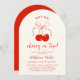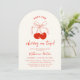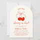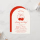 Celebre o amor e a alegria com este encantador chá de panela de cereja! Apresentando uma ilustração de cereja vermelha, branca, amarrada a um fundo de arco e retrocetro, essa design é perfeita para um tema de chá de panela lúgubre e doce. A tipografia da na moda adiciona um toque moderno, fazer ideal para as celebrações da moda.