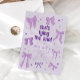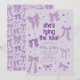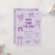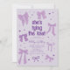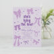 Cartão de chá de panela com tema arco roxo coquete com ilustração de fitas e corações. O texto diz "ela é casando".